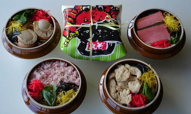 えぞ釜めしは、洞爺湖温泉生まれ。かに、さけ、ホタテ、うに、鶏肉、牛肉、、、。